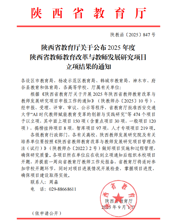 近日,陕西省教育厅下发了《陕西省教育厅关于公布2025年度陕西省教师教育改革与教师发展研究项目立项结果的通知》(陕教函〔2025〕847号),我校教师在此次立项中成绩斐然,实现新的突破。