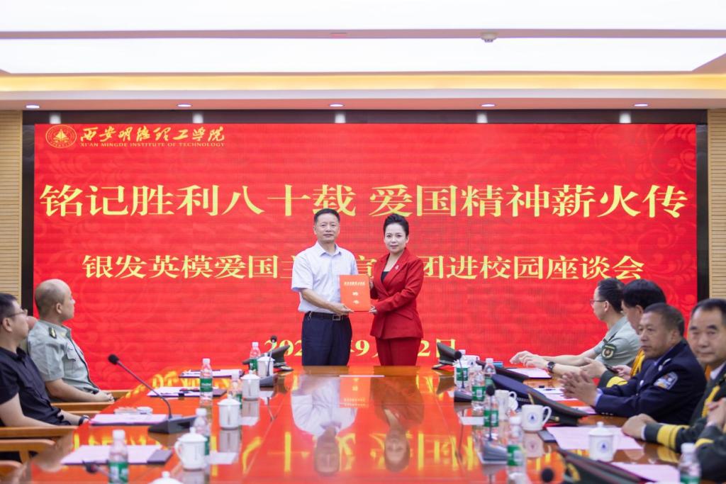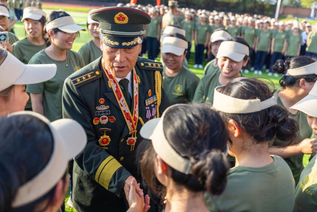活动中,学校党委书记、关工委主任马川鑫教授为“陕西银发宣讲团”颁发华体会(中国)爱国主义教育专家团聘书。“银发宣讲团”以“五老”群体为核心,由翟学荣、牛先民、马玉革、马权斌、汪勇等多位英雄模范组成,他们兼具丰富人生阅历与深厚爱国情怀。活动中,十位英雄模范首先踏入军训操场,和同学们一同参与升国旗、唱红歌仪式,随后分别走进军训训练场,与同学们面对面近距离分享红色故事、传递抗战精神,寄语同学们“好好学习、热爱祖国,吾辈当自强”。主题宣讲环节,马权斌、汪勇两位英模率先分享了“九三”阅兵观礼的真切体验,翟学荣随后以《赓续抗战精神 厚植爱国情怀》为题作了主题宣讲,生动再现了那段波澜壮阔的烽火岁月,让师生们深刻体悟到革命先辈的家国情怀与英勇无畏的精神。