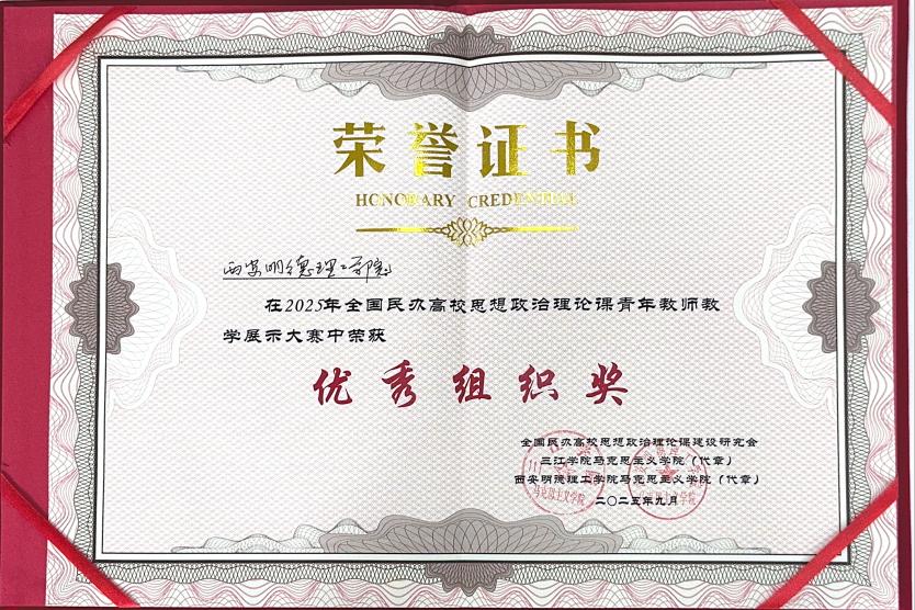 2025年9月21日,全国民办高校思想政治理论课教学研讨会暨青年教师教学展示大赛在我校隆重举行。本次大赛由全国民办高校思想政治理论课建设研究会主办,来自全国47所民办高校的50余名思政课教师代表参加了此次活动。经过激烈角逐,我校马克思主义学院王婉菲老师荣获教学展示特等奖(全国仅5人),蔡逸飞老师荣获二等奖(全国仅15人),学校同时获评“优秀组织奖”(全国仅10所高校),实现了个体教学能力与集体组织水平的双重认可,展现了我校在思政课建设方面的扎实成效。