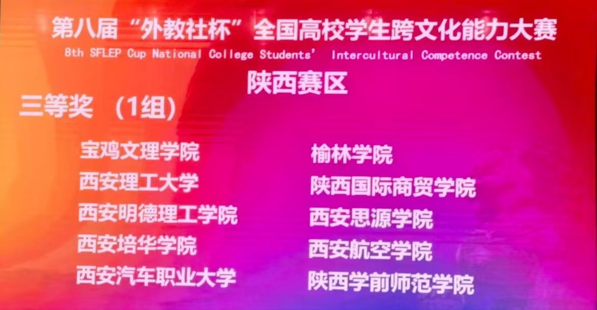 10月18日至19日,由陕西高等学校大学外语教学研究会组织的2025年第八届“外教社杯”全国高校学生跨文化能力大赛陕西赛区复赛与决赛在西安石油大学雁塔校区圆满落幕。我校英语专业张婉琪、会计学专业高思凡和机器人工程专业房博雅三人组成的代表队凭借扎实的跨文化理论功底、出色的现场应变能力与团队协作精神,最终荣获省级三等奖,充分展现了学校在国际化人才培养领域的扎实成果。
