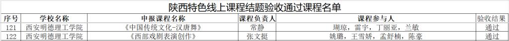 近日,根据《陕西省教育厅办公室关于公布陕西特色线上课程验收认定结果的通知》,学校《西部戏剧表演创作》与《中国传统文化—汉唐舞》两门课程成功通过验收,被正式认定为“陕西省特色线上课程”。根据《陕西省教育厅办公室关于做好陕西特色线上课程立项建设工作的通知》精神,通过省厅验收的课程将自动认定为省级一流课程。至此,学校已获批的省级一流本科课程总数在原有18门的基础上新增至20门,课程建设实现新的跨越,充分体现了学校课程建设的高质量与可持续性发展。