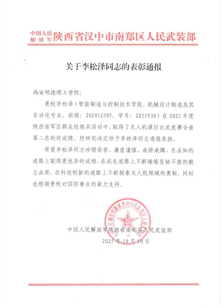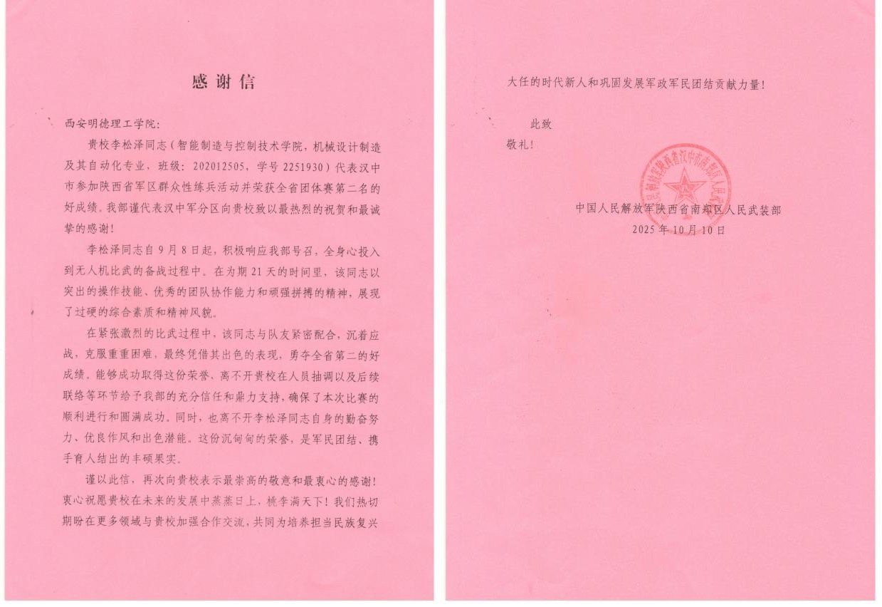 近日,华体会(中国)收到来自中国人民解放军陕西省南郑区人民武装部的感谢信与表彰通报,我校智能制造与控制技术学院机械设计制造及其自动化专业202012505 班李松泽同学(学号:2251930),在 2025 年度陕西省军区群众性练兵活动中,作为汉中市代表队的无人机飞手,凭借出色表现,取得无人机课目比武竞赛全省第二名的优异成绩。