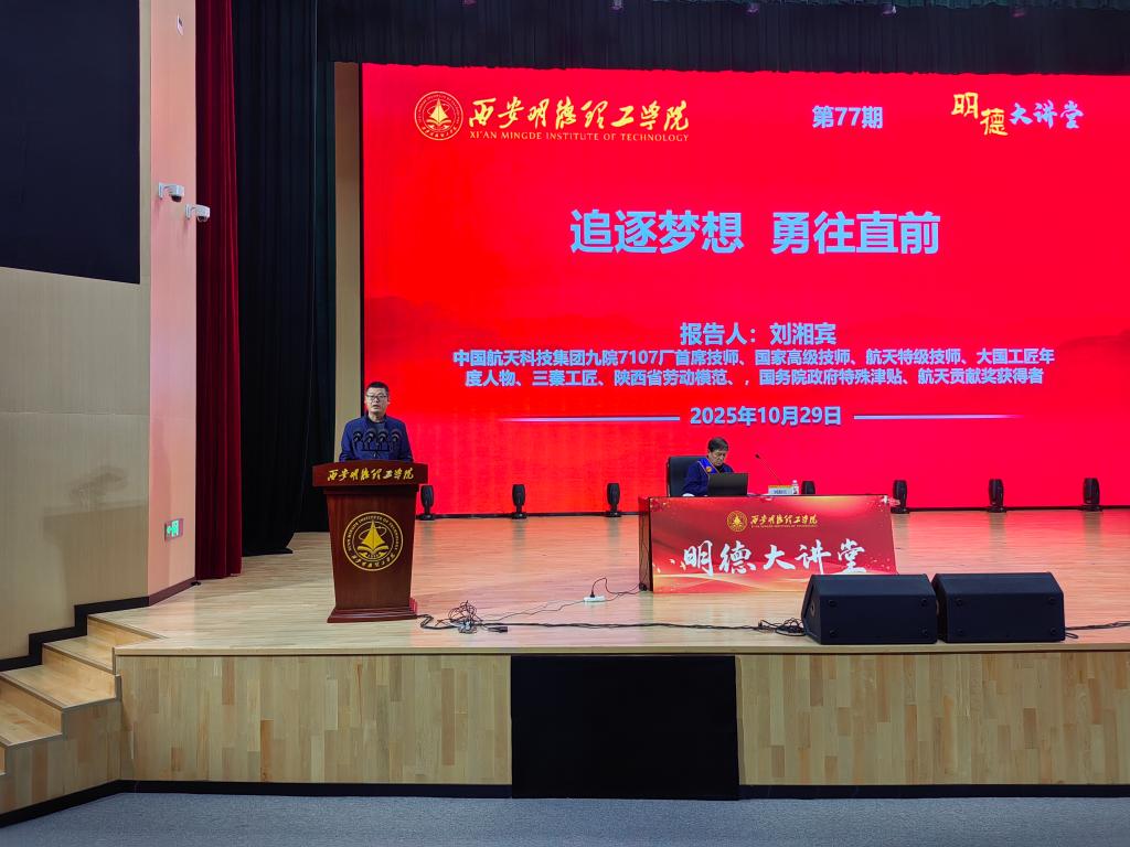 为大力弘扬工匠精神,引导青年学子树立职业理想、坚定奋斗信念,10月29日,我校特邀中国航天科技集团有限公司第九研究院七一〇七厂首席技师刘湘宾做客“明德大讲堂”,以“追逐梦想 勇往直前”为主题,为1000余名师生带来了一场兼具思想深度与实践温度的专题讲座。讲座由马克思主义学院及通识教育学院党委书记王君涛主持。