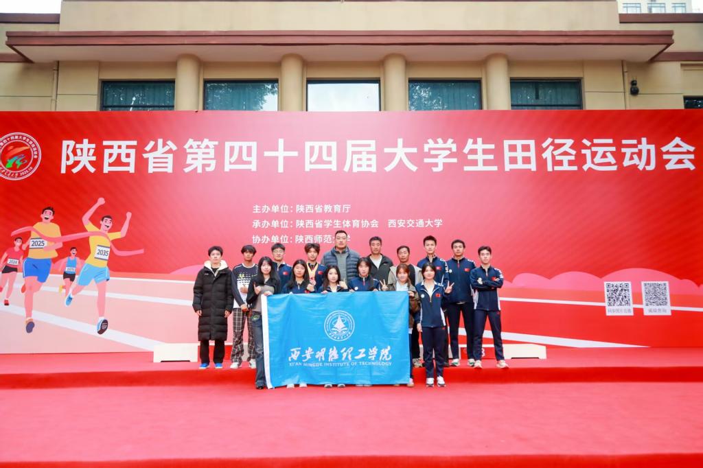 我校田径队于2025年10月25日至10月28日参加了由陕西省教育厅和陕西省体育局主办,西安交通大学承办的陕西省第四十四届大学生田径运动会。我校15名运动健儿在程家星、严麦雄、刘响和朱晓东的带领下,凭借顽强拼搏的精神与扎实的竞技实力,在多个项目中突破自我,为校赢得荣誉,展现了新时代大学生的青春风采,勇创佳绩。