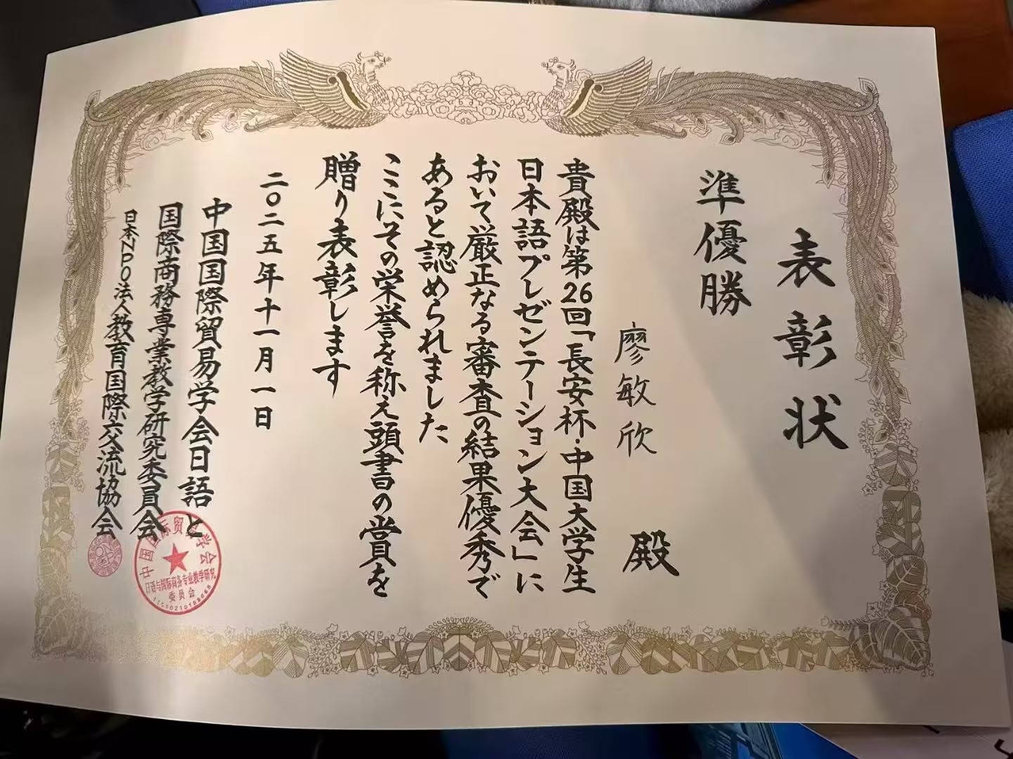 近日,第26届“长安杯”中国大学生日语才能演示大赛圆满落幕。华体会(中国)语言文化传播学院日语专业2023级学生廖敏欣凭借扎实的语言功底与出色表现,斩获甲组亚军;指导教师张翔获评优秀指导教师奖,彰显了我校日语专业的教学实力与人才培养成效。