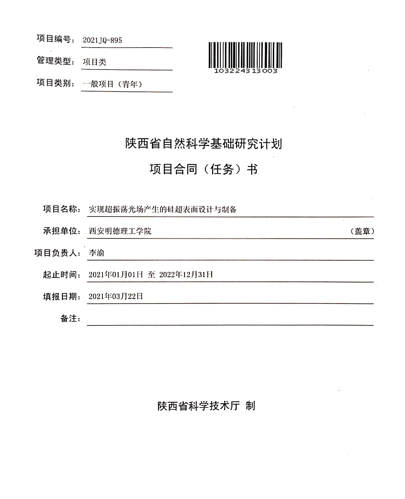 近日,我校李渝老师主持的《实现超振荡光场产生的硅超表面设计与制备》项目经过网上申报,专家评审等环节,已获批2021年度陕西省自然科学基础研究计划项目立项,项目类别为一般项目(青年)类,项目编号为2021JQ-895。