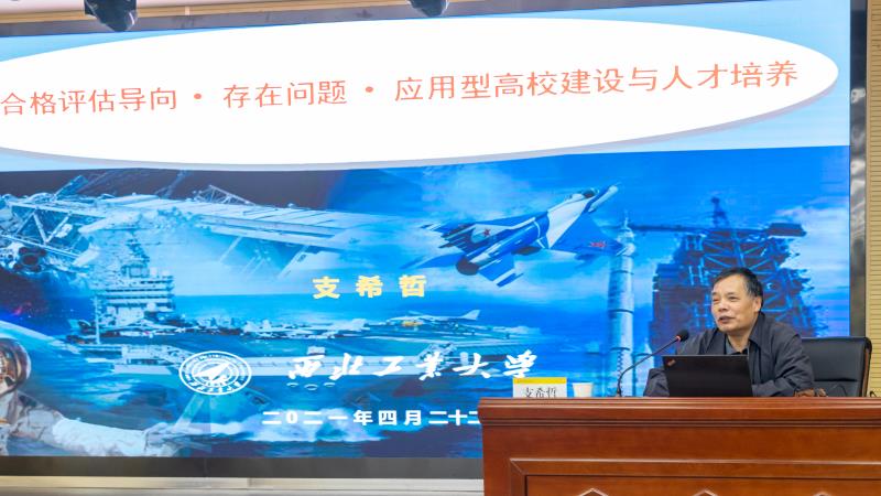 为有效推进我校本科教学工作合格评估建设工作,4月22日上午,学校邀请西北工业大学支希哲教授在建德楼203报告厅为我校教职工作了合格评估专题讲座。校长杨健君、副校长王斌宁、党委副书记董昊、财务总监马晓军出席,二级学院院长、办公室主任、教学管理人员、专业负责人及教师代表、各职能部门正副职领导等参加了讲座。讲座由庾鲜海副校长主持。