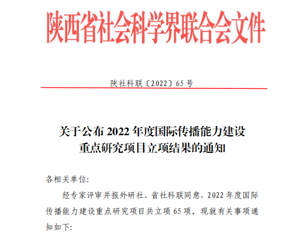 国际传播能力建设重点研究项目,由陕西省社科联、外研社组织实施,每年面向全省公开申报。2022年度国际传播能力建设重点研究项目共立项65项,我校首次组织参与,并成功立项。