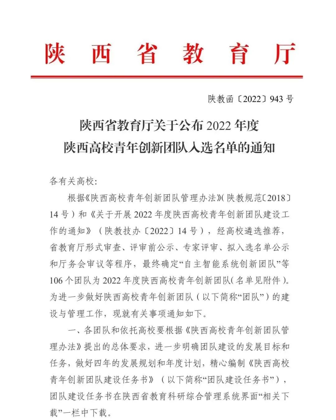 近日,陕西省教育厅印发《陕西省教育厅关于公布2022年度陕西高校青年创新团队入选名单的通知》,全省共计106个团队入选。其中,我校赵盼博士领衔申报的“航空复材构件先进制造技术创新团队”成功入选。