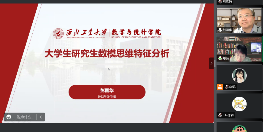 为更好地备战2022年全国大学生数学建模竞赛,9月8日通识教育学院特邀请西北工业大学数学与统计学院彭国华教授开展了数学建模专题报告。受疫情影响,今年的专题报告采用腾讯会议线上进行。报告由通识教育学院副院长郑薇主持,数学建模竞赛指导组教师以及全体参赛学生参加了此次报告会。