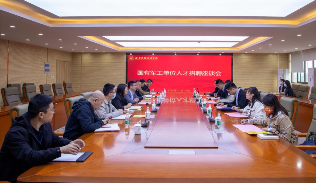 10月10日上午,中国航空工业集团公司西安飞行自动控制研究所(618所)人力资源部部长李玮奇、北京卫星环境工程研究所西安分中心(511所)人事主管余美玉、西安空间无线电技术研究所(504所)人事主管于铠、北京中科航天人才服务有限公司陕西分公司业务总监宋文博等一行10人到访我校进行人才招聘交流座谈,副校长刘星出席了座谈会,会议由招生就业中心副主任王东辉主持。