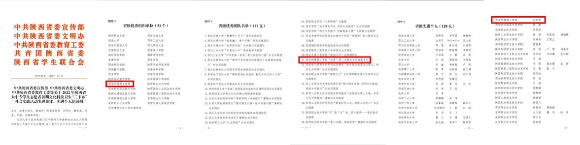 近日,中共陕西省委宣传部、中共陕西省委文明办、陕西省委教育工委、共青团陕西省委、陕西省学生联合会联合下发了《关于2022年陕西省大中专学生志愿者暑期文化科技卫生“三下乡”社会实践活动先进集体、先进个人的通报》,我校荣获省级优秀组织单位称号,"沐晨"爱心支教社会实践服务队荣获省级优秀团队称号,教师白丽萍荣获省级优秀先进个人称号。