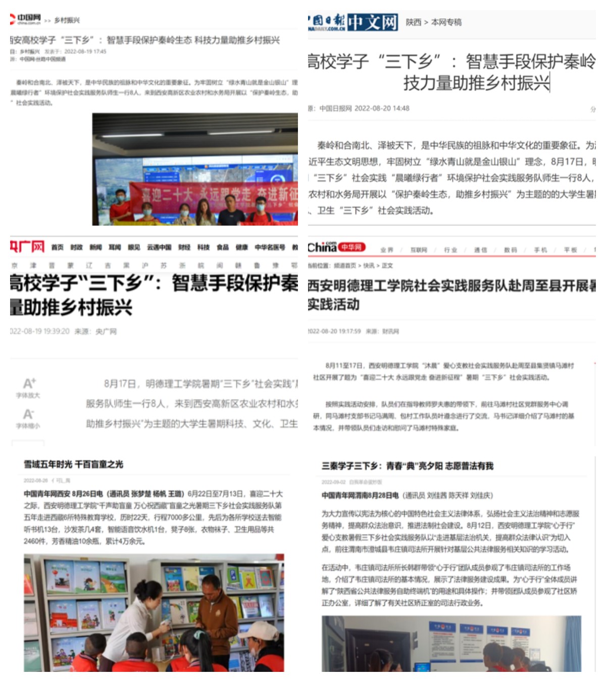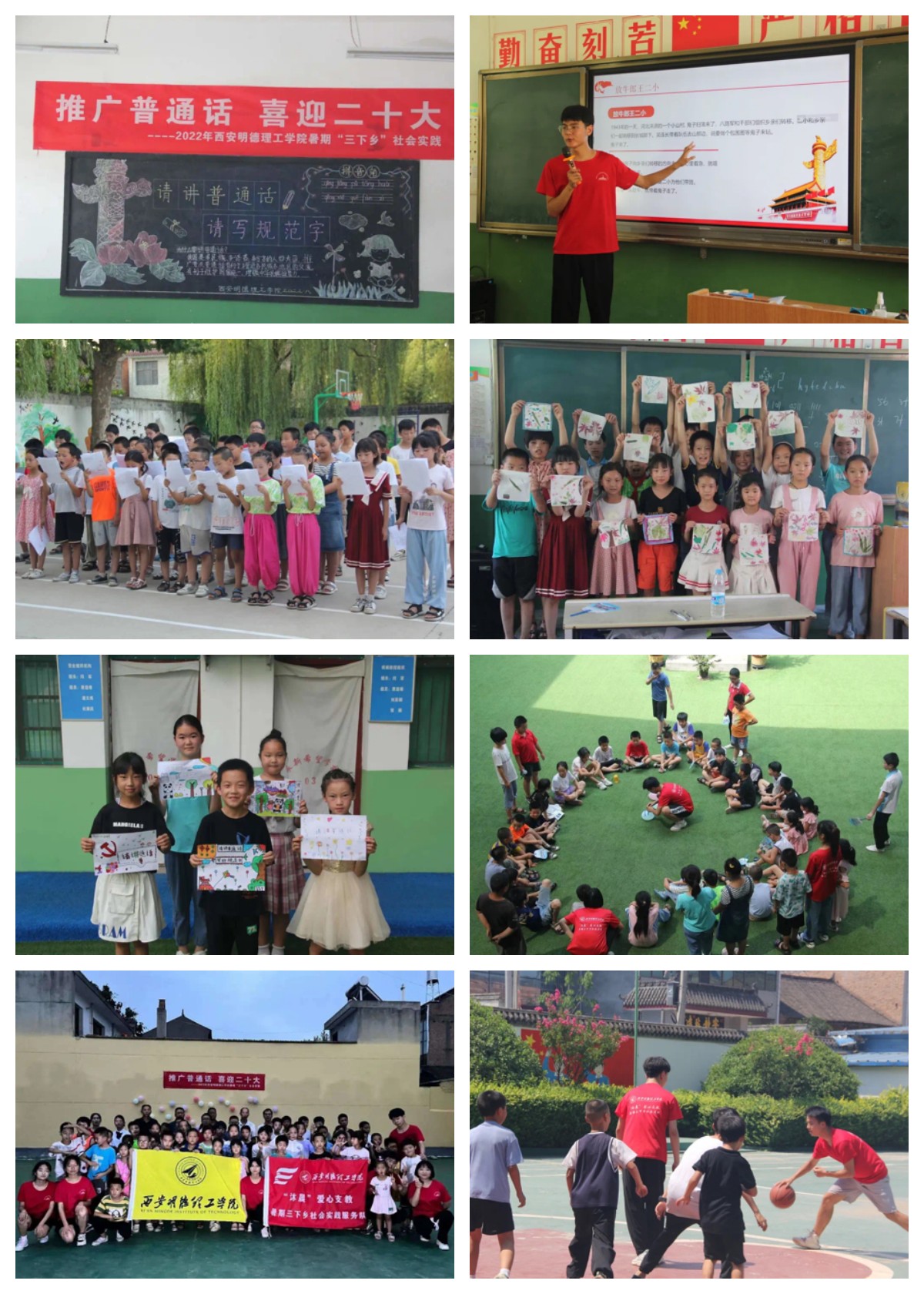 西安明理工学院2022年暑期"三下乡"社会实践活动以理论普及宣讲团、党史学习教育团、乡村振兴促进团、发展成就观察团、民族团结实践团五个板块为基础,采取线上与线下、团队与个人实践相结合的方式,围绕理论政策宣讲、巩固脱贫成果、助力乡村振兴、保护大美秦岭、科技助农帮扶、国情社情观察、追寻红色基因、教育关爱帮扶、“返家乡·进企业·回母校”等主题开展了内容丰富的暑期社会实践活动。