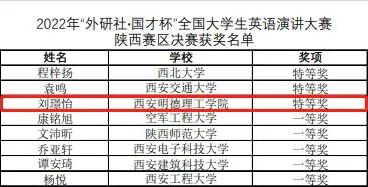 11月5日,“外研社•国才杯”全国大学生英语挑战赛陕西省赛在线上拉开帷幕。我校2021级刘璟怡同学与西北大学、西安交通大学参赛选手并列荣获演讲省赛特等奖,并即将参加演讲赛全国总决赛,突破我校外语类竞赛历史最好成绩。