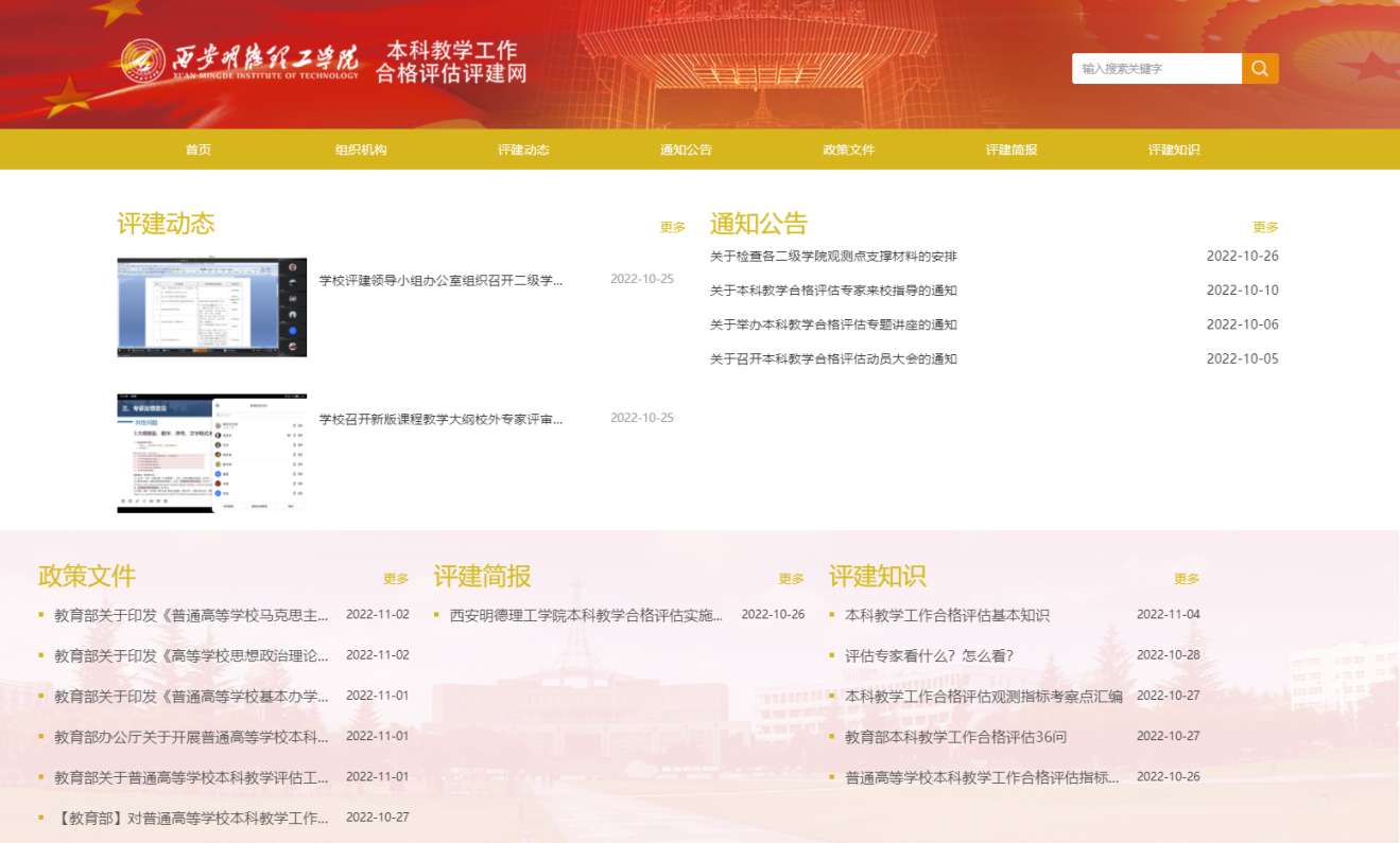 “评建网”包括组织机构、评建动态、通知公告、政策文件、评建简报和评建知识等栏目,将作为学校评建工作信息发布的主平台和信息交流的主渠道,实时推送本科教学工作合格评估的相关工作要求、重要政策精神,共享校内外专家教育观点,报道全校各单位开展本科教学评估工作的动态和经验做法等,欢迎各单位积极投稿、报送材料。