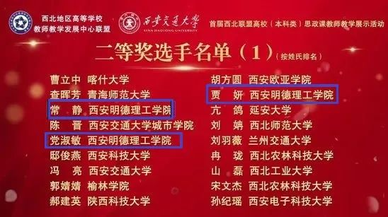 本次教学展示活动,共有西北地区43所高校的202位参赛选手参加比赛。我校共有6名教师参加,在两轮比赛中,我院教师在赛场上做到充分发挥,精彩展示,表现出扎实的理论功底和过硬的教学本领,最终常静、党淑敏、贾妍3位老师荣获二等奖,王璐老师荣获三等奖,学校获评优秀组织奖。