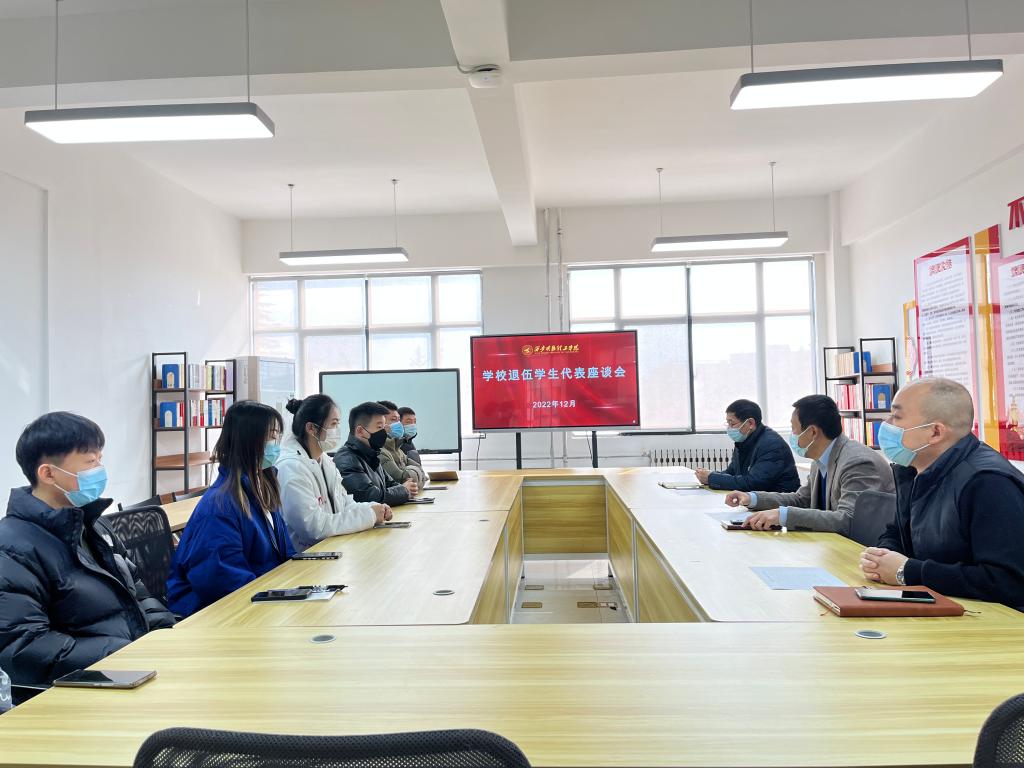 12月2日中午,学校退伍学生代表座谈会在明志楼南306会议室举行。学校党委副书记董昊,人武部部长童杨梓参加会议。座谈会由学校征兵工作站站长李传斌主持。