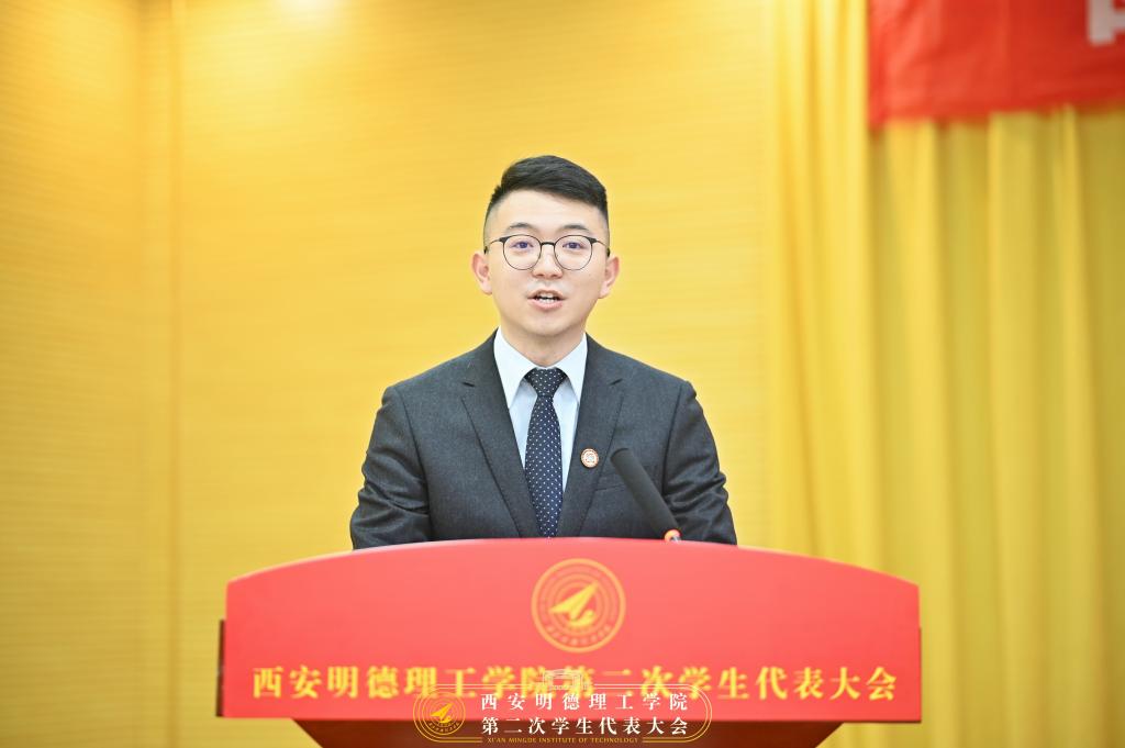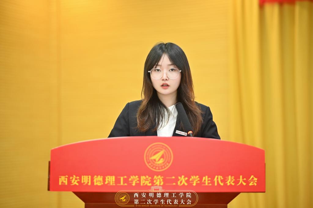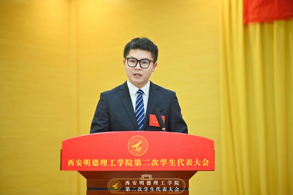 校学生会主席团成员张嘉文同学作题为《生逢其时重任在肩砥砺奋进团结带领全校同学在推进我校向特色鲜明、国内一流,具有一定国际知名度的应用型民办大学的建设进程中贡献青春力量》的学生会工作报告。