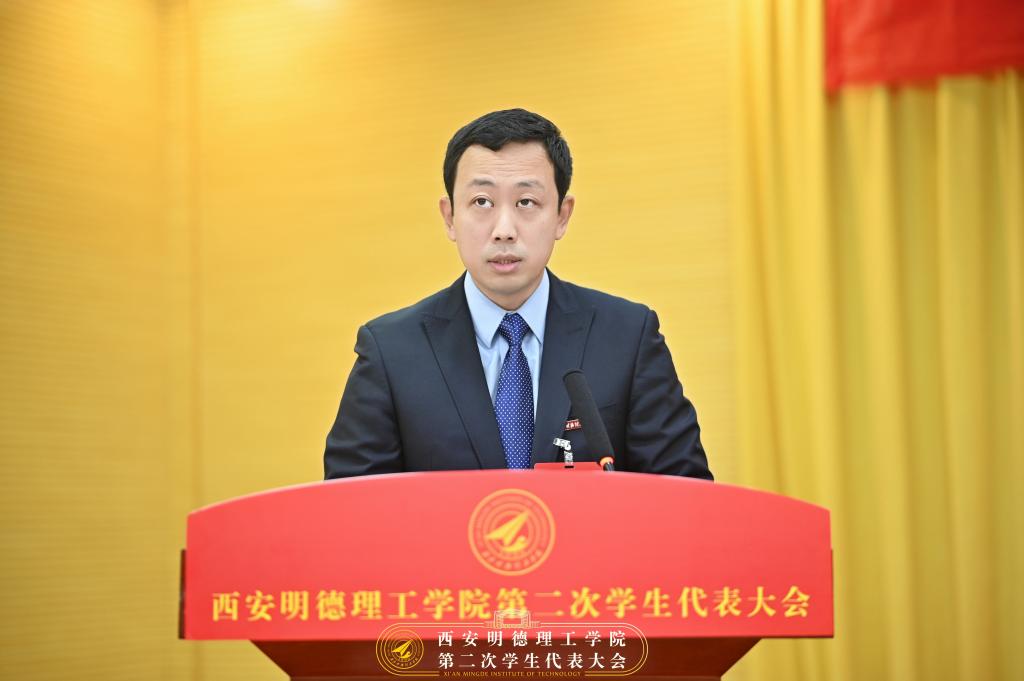 校党委副书记董昊同志讲话,他代表学校党委对大会的召开表示祝贺、向嘉宾们表示诚挚的欢迎和衷心的感谢,向与会代表、广大团学干部和青年学生表达了亲切的问候。他肯定了在过去的一年里,我校各级团学组织和广大青年,取得的显著成绩和为学校改革、发展作出的积极贡献,并对全校青年提出了希望和要求:一是树立远大理想,绘就信念坚定的政治底色,希望广大青年要以实现中华民族伟大复兴为己任,增强做中国人的志气、骨气和底气,树立马克思主义的信仰。坚定不移的听党话、跟党走,怀抱梦想又脚踏实地,立志做有理想、敢担当、能吃苦、肯奋斗的时代好青年。二是勇于担当作为,锤炼建功立业的过硬本领。一代人有一代人的长征,一代人有一代人的担当,在各时代新征程中,各行各业、各条战线的青年以及在校大学生展现出了不怕苦、不畏难、不惧牺牲的青春担当。三是团结服务同学,成为同学们真心拥护的学生领袖。希望同学们今后的学习工作中能够发扬“全心全意为同学服务”的工作作风,积极密切与青年学生的联系,主动倾听青年学生的心声,努力为青年学生的成长成才办实事、办好事,成为同学们信服、拥护的学生领袖。