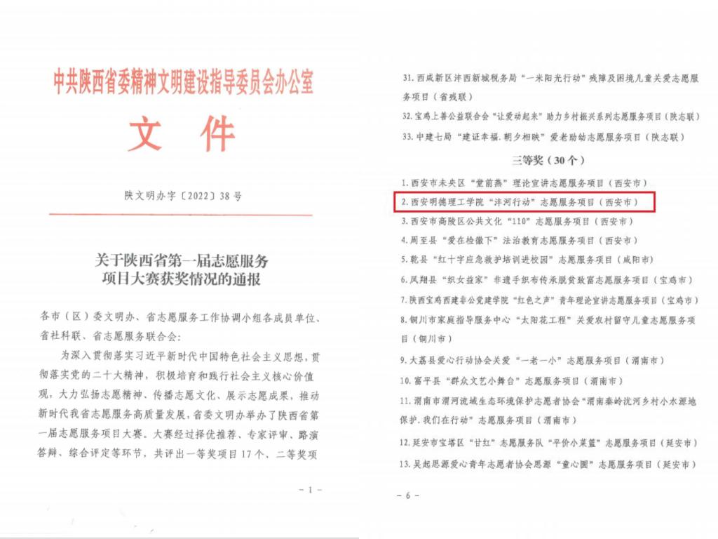 为深入贯彻落实习近平新时代中国特色社会主义思想,贯彻落实党的二十大精神,积极培育和践行社会主义核心价值观,大力弘扬志愿精神、传播志愿文化、展示志愿成果,推动新时代我省志愿服务高质量发展,中共陕西省委宣传部、陕西省委文明办举办了“陕西省第一届志愿服务项目大赛”。大赛经过择优推荐、专家评审、路演答辩、综合评定等环节,共评出一等奖项目17个、二等奖项目33个、三等奖项目30个、优秀奖项目76个。我校团委实施的“沣河行动”志愿服务项目荣获三等奖。