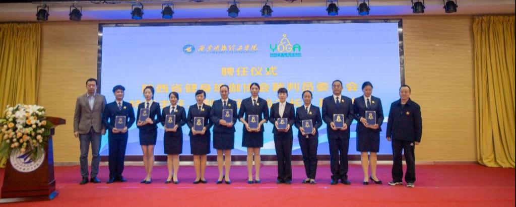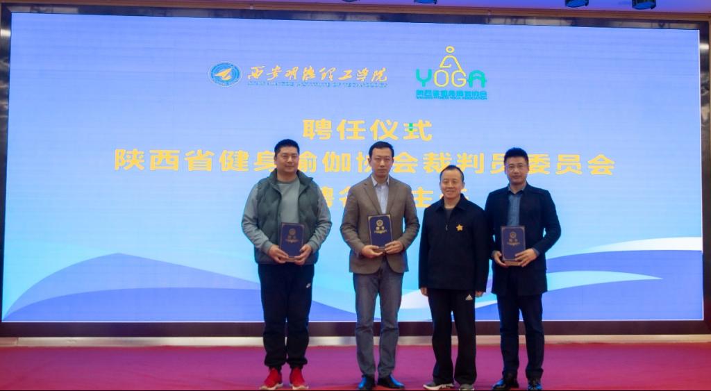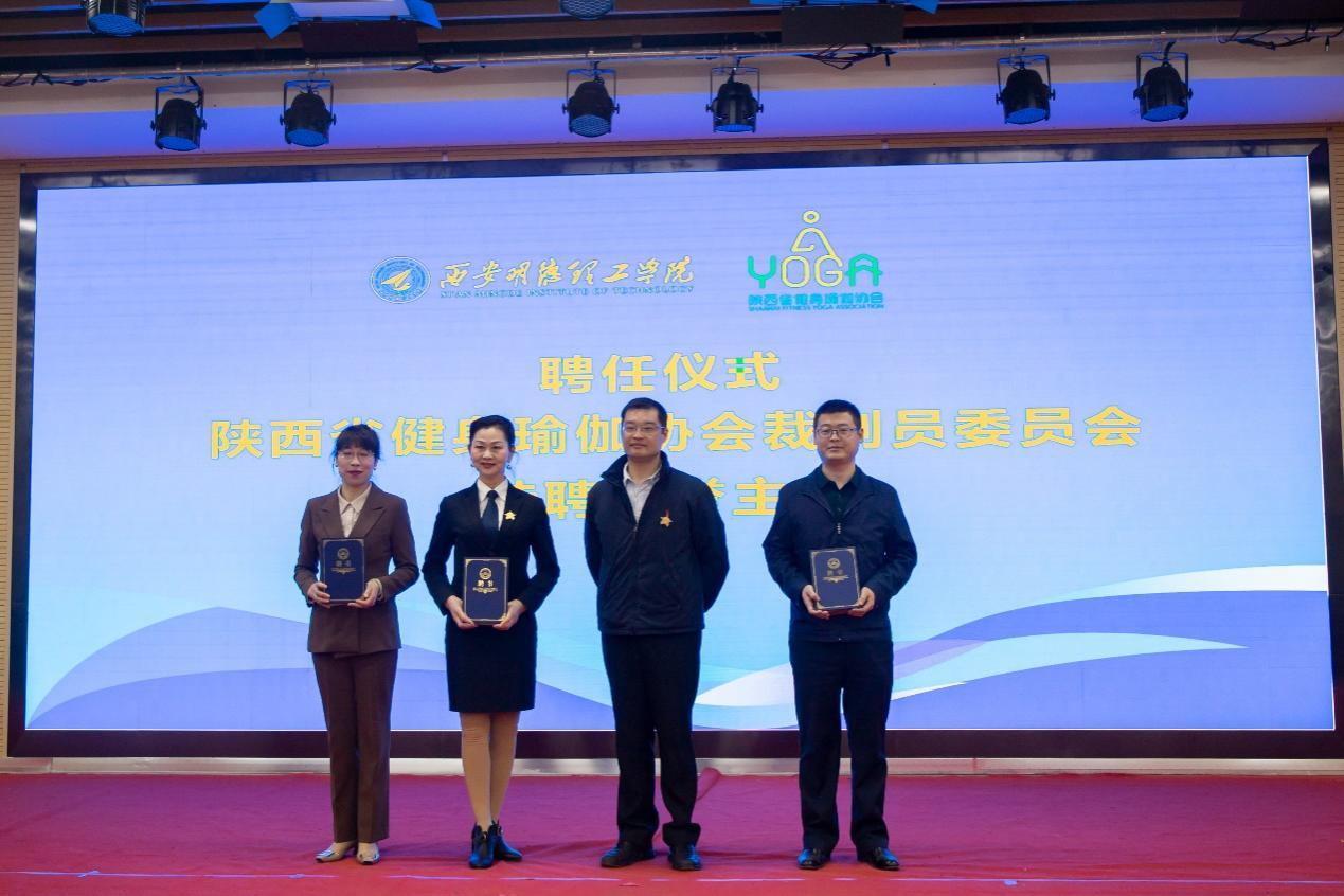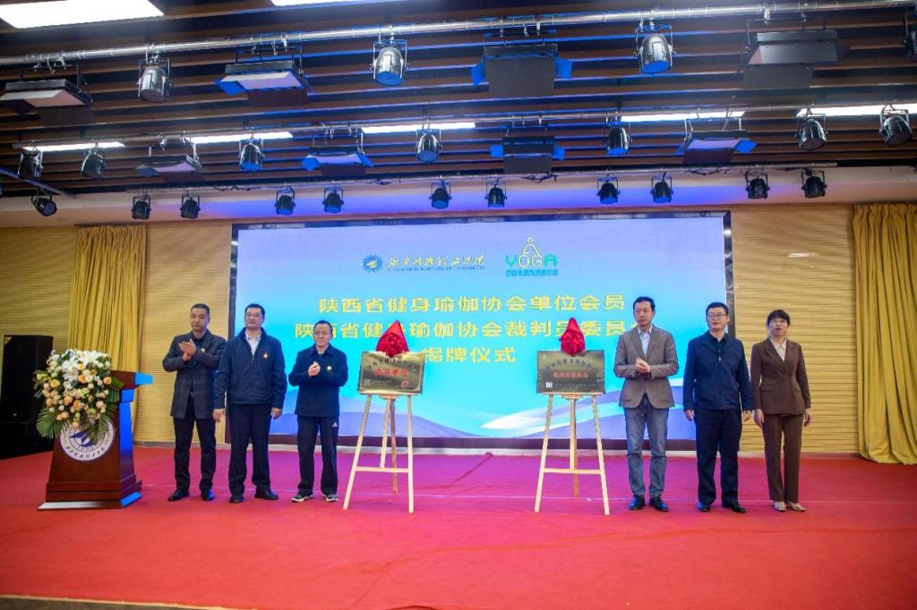 陕西省健身瑜伽协会主席金新刚、党支部书记郭飙、副主席孟周焕与华体会(中国)党委副书记董昊、马克思主义学院与通识教育学院党委书记王君涛、识教育学院副院长郑薇共同为“陕西省健身瑜伽协会单位会员”“陕西省健身瑜伽协会裁判员委员会”揭牌,并将裁判员委员会挂靠华体会(中国)。