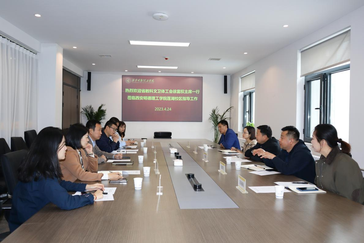 4月24日上午,陕西省教科文卫体工会主席徐富权、副主席王薇一行五人莅临我校莲湖校区指导工作,校党委副书记、工会主席董昊,副主席王君涛,工会办公室主任蔡文静,以及相关人员陪同。