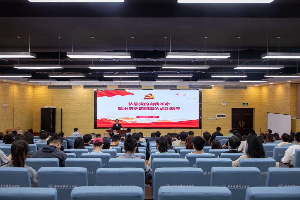 报告会上,杨平教授从“勇于自我革命是中国共产党最鲜明的政治品格”“勇于自我革命是党探索跳出历史周期率的第二个答案”“中国共产党百年的奋斗史也是一部自我革命史”“中国共产党百年自我革命的宝贵经验”“不断完善以全面从严治党推进自我革命的有效途径”等五个方面,以深厚的理论阐释、生动的事例分析和详实的史料解读,全面回顾我党在不同历史时期勇于自我革命的奋斗历程,对自我革命的丰富内涵、实践要求、精神实质进行全面解读,为我校进一步学深悟透习近平新时代中国特色社会主义思想,更加扎实开展好主题教育提供了理论指引。