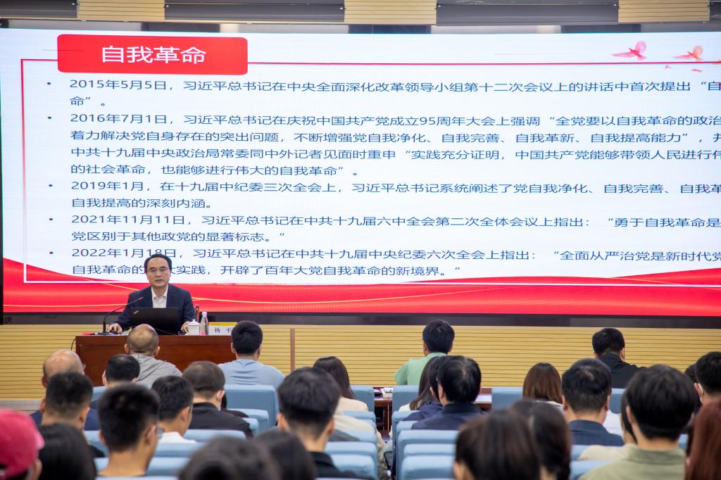 为推动学习贯彻习近平新时代中国特色社会主义思想主题教育走深走实,6月2日下午,学校邀请陕西师范大学马克思主义学院杨平教授作《依靠党的自我革命跳出历史周期率的成功路径》为主题的专题辅导报告。会议由学校党委组织宣传部部长高超主持。全体处科级干部、师生代表参加报告会。