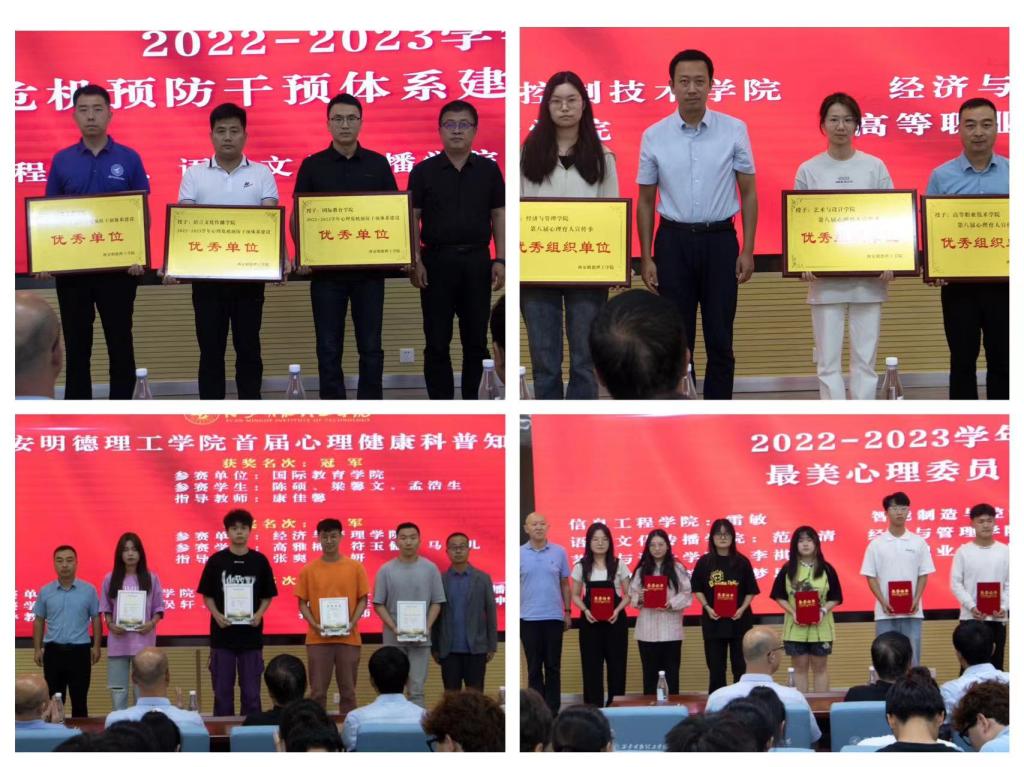 会上,大学生心理健康教育中心主任薛飘老师作题为《立德树人守初心心理育人担使命》的工作总结;党委学生工作部副部长童杨梓宣读了学校《关于表彰2022-2023学年心理健康教育工作暨第八届“阳光护航”心理育人宣传季“先进集体”和优秀个人的决定》;向2022-2023学年心理危机预防与干预体系建设优秀单位、第八届心理育人宣传季优秀组织单位、2022-2023学年“最奉献心理育人好老师”、2022-2023学年“最美心理委员”以及学校首届心理健康科普知识竞赛获奖的学生和指导教师分别进行了表彰。