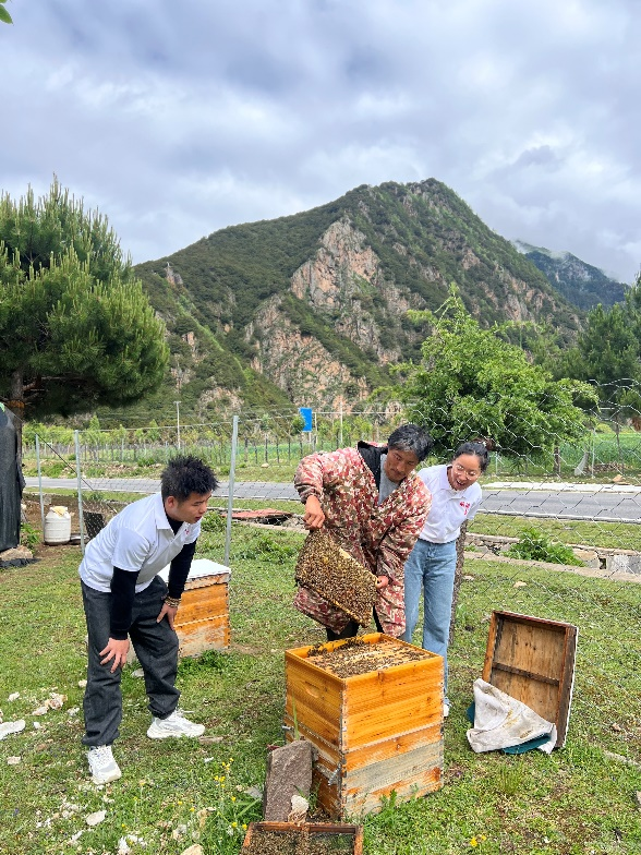 与此同时,为进一步展示青春力量,助力乡村振兴,志愿者团队在巴河镇干部赵星的引领之下,先后走进巴河镇连巴村红颜草莓采摘示范园拍摄宣传照片并直播带货助力村民售卖高原草莓;实地参观调研了具有藏区特产代表性的简易养蜂“基地”、灵芝、贝母等中草药种植基地、藏香猪火腿生产基地等当地特色产业机基地,实地调研产品研发、技术需求、销售途径等情况,在“党旗红 产业兴 聚合力 促发展”的战略和科技助农的带动下,以特色产业促经济发展,为雪域高原之上,蓝天白云之下的巴河镇更添活力。