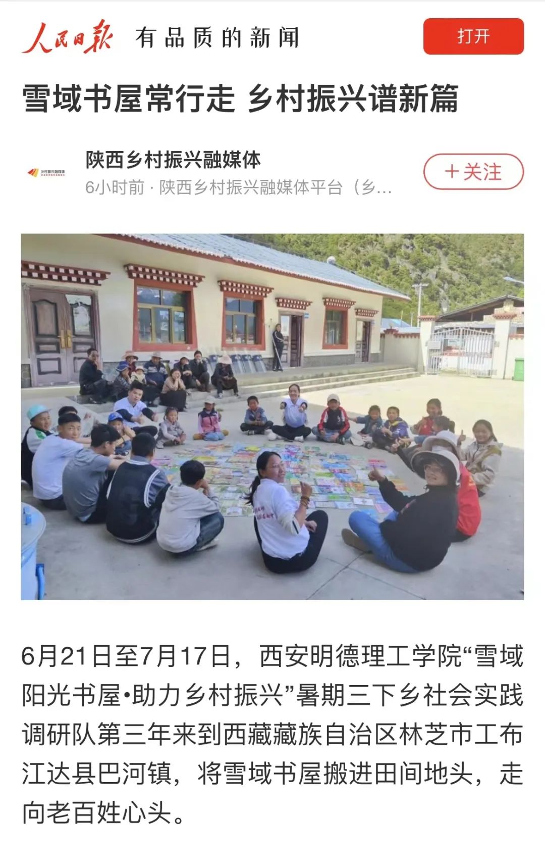 “雪域阳光书屋•助力乡村振兴”暑期三下乡社会实践队怀揣乡村振兴的热忱,积极开展社会服务,传递党的声音,凝聚思想共识,助力基层乡村振兴,也受到了学习强国、中国网、腾讯新闻、三秦都市报、西安晚报等媒体广泛的宣传报道,扩大了我校的社会影响力。