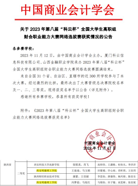 近日,2023年第八届“科云杯”全国大学生高职组财会职业能力大赛网络选拔赛圆满结束,我校高等职业技术学院学生荣获陕西省二等奖两项,获奖学生名单如下: