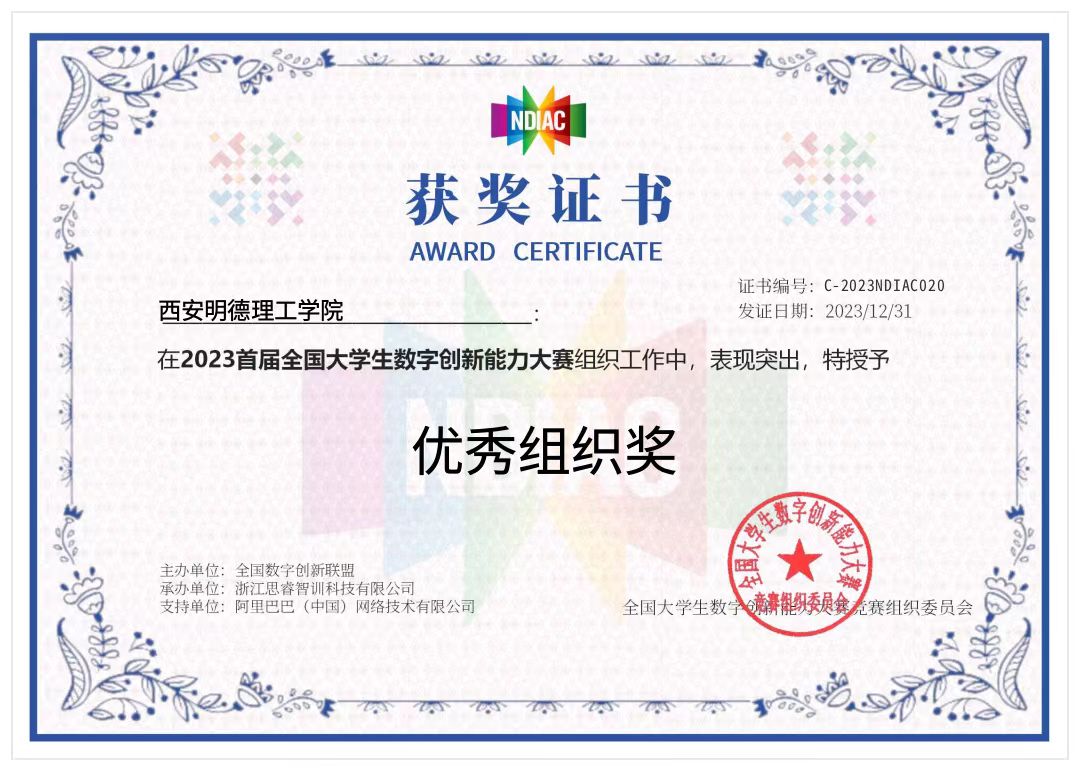 近日,2023首届全国大学生数字创新能力大赛结果公布:我校高等职业技术学院学生获全国二等奖3项、三等奖1项,5名教师获优秀指导教师奖,学校获优秀组织奖。
