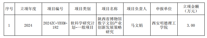 2014年1月18日,陕西省科技厅公布了2024年度陕西省科技计划项目立项结果,我校艺术与设计学院教师马文娟申报的《陕西省博物馆数字文创产业创新发展策略研究》项目获2024年省级科技计划项目-创新能力支撑计划软科学研究计划项目立项。