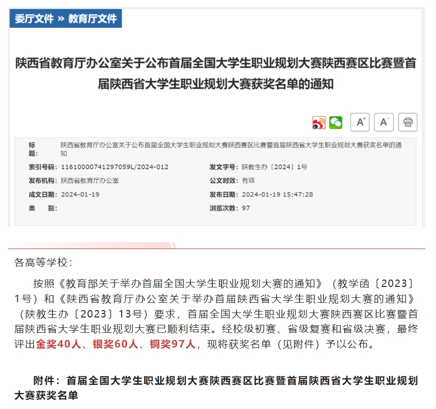 1月19日,陕西省教育厅公布了首届全国大学生职业规划大赛陕西赛区比赛暨首届陕西省大学生职业规划大赛获奖名单。经校级初赛、省级复赛和省级决赛,我校参赛选手获得银奖1项。