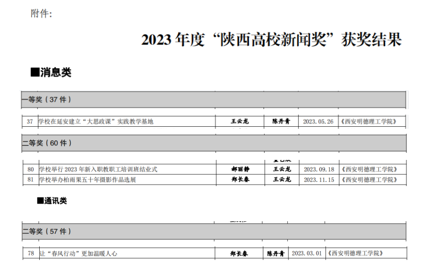 通过评委会严格评审,我校党委组织宣传部王云龙老师撰写的《学校在延安建立“大思政课”实践教学基地》、教师发展中心郝丽静老师撰写的《学校举行2023年新入职教职工培训班结业式》分别获得消息类一等奖和二等奖,党委组织宣传部郑长春老师撰写的《学校举办柏雨果五十年摄影作品选展》《让“春风行动”更加温暖人心》分别获得消息类和通讯类二等奖。