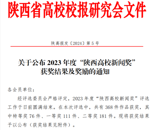 日前,由陕西省高校校报研究会主办的2023年度“陕西高校新闻奖”评选结果揭晓,我校4件作品获奖,其中一等奖1项、二等奖3项。