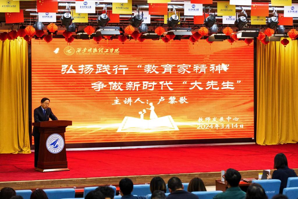 卢黎歌教授以“躬耕教坛,强国有我—弘扬践行‘教育家’精神,争做新时代‘大先生’”为题。他从“新质生产力”谈到创新,围绕“教育家精神的提出及其背景”、“教育家精神”的主要内涵、“在躬耕教坛,强国有我中立新功建伟业”三个方面,深刻阐述了何谓教育家、何谓教育家精神。他认为,心有大我,至诚报国的理想信念是为教育家之立德树人定航;言为士则,行为示范的道德情操是为教育家之涵养德行定规;启智润心,因材施教的育人智慧是为教育家之造就人才定基;勤学笃行,求是创新的躬耕态度是为教育家之终身践履定行;乐教爱生,甘于奉献的仁爱之心是为教育家之书写大爱定根;胸怀天下,以文化人的弘道追求是为教育家之担当使命定位。卢黎歌教授结合自身教学实践,以朴实的语言、真挚的情感生动诠释了教育家精神的深刻内涵和实践要求,倡导广大教师在躬耕教坛强国有我中立新功、建伟业,引起了我校教师的广泛共鸣。