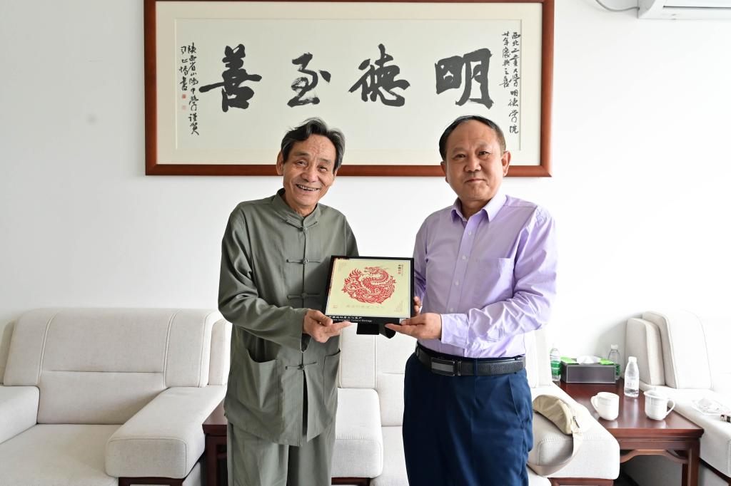 活动前,学校校长王志刚教授热情接待了王向荣老师,并代表学校为王向荣老师和他的徒弟陈向钧老师赠送了学校黄土匠心工作室学生制作的陕北民俗剪纸。