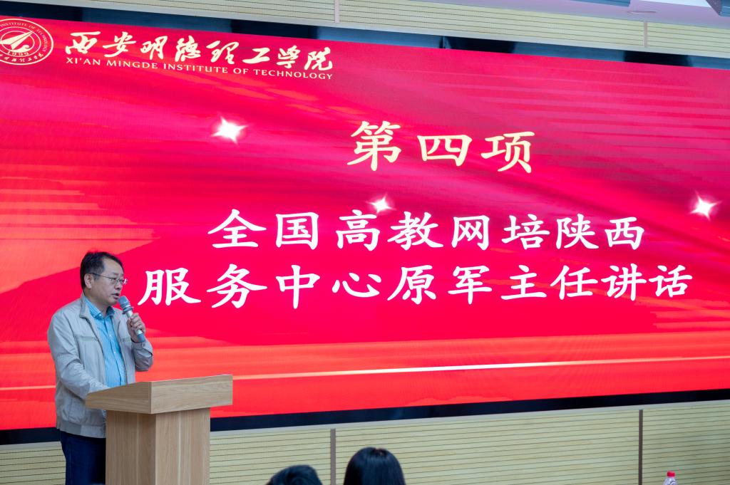 开班仪式在雄壮的国歌声中开幕;郝丽静副主任介绍本次培训班暨工作坊整体工作安排;全国高校教师网络培训中心陕西服务中心原军主任讲话,他介绍该中心的教师培养理念、工作范畴、工作成效。该中心把“创新高校教师培训模式,传播教育教学优秀成果,推动高校教师专业发展,服务高校教师终身学习,促进高等教育质量提高”作为不懈追求的工作目标,为促进我国高校教学改革、提高高等教育质量,贡献力量。原军主任预祝本次培训班暨工作坊取得圆满成功!
