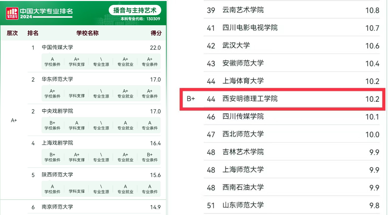 其中,播音与主持艺术专业排名再次上升,以综合10.2分位居全国第44名,迈入全国50强、全国民办第3名,陕西民办第1名。同时连续两年获B+(全国排名前10%-30%)等级,实现了我校软科B+级排名上的突破!该专业作为陕西省一流专业建设专业,以“厚基础、重实践、求创新”为办学理念,对标一流本科专业建设标准、专业认证标准等,持续推进专业内涵式发展,以一流专业”建设为引领,全面推进一流课程建设和基层教学组织建设,大力推动课堂教学改革创新,打好教育教学改革攻坚战,专业建设水平与人才培养质量取得丰硕成果。
