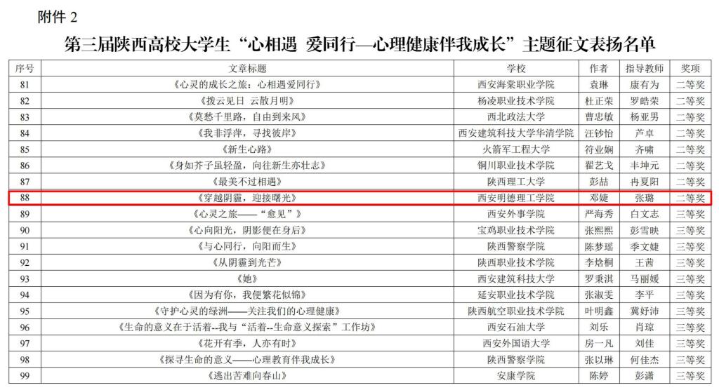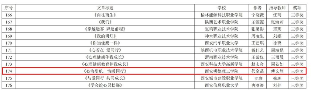 在第三届陕西高校大学生“心相遇 爱同行—心理健康伴我成长”主题征文活动中,高等职业技术学院2022级会计信息管理专业邓婕同学的参赛作品《穿越阴霾,迎接曙光》荣获二等奖;信息工程学院2023级计算机科学与技术(专升本)专业代金晶同学的参赛作品《心海引航,情暖同行》荣获三等奖。