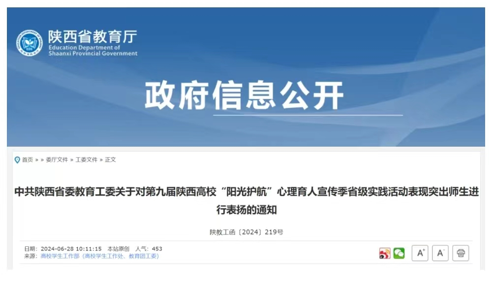 近日,中共陕西省委教育工委公布了《中共陕西省委教育工委关于对第九届陕西高校“阳光护航”心理育人宣传季省级实践活动表现突出师生进行表扬的通知》,我校师生荣获多项荣誉。