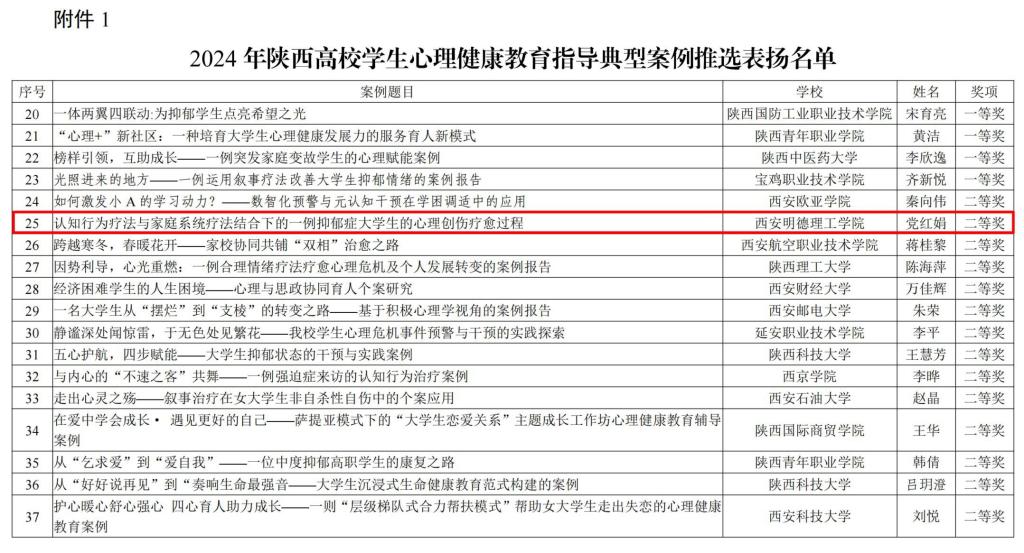 在2024年陕西高校学生心理健康教育指导典型案例推选活动中,艺术与设计学院辅导员党红娟的参赛作品《认知行为疗法与家庭系统疗法结合下的一例抑郁症大学生的心理创伤疗愈过程》荣获二等奖;艺术与设计学院辅导员的参赛作品《以心育“新”多方联动——大学生心理危机干预个案》荣获三等奖。