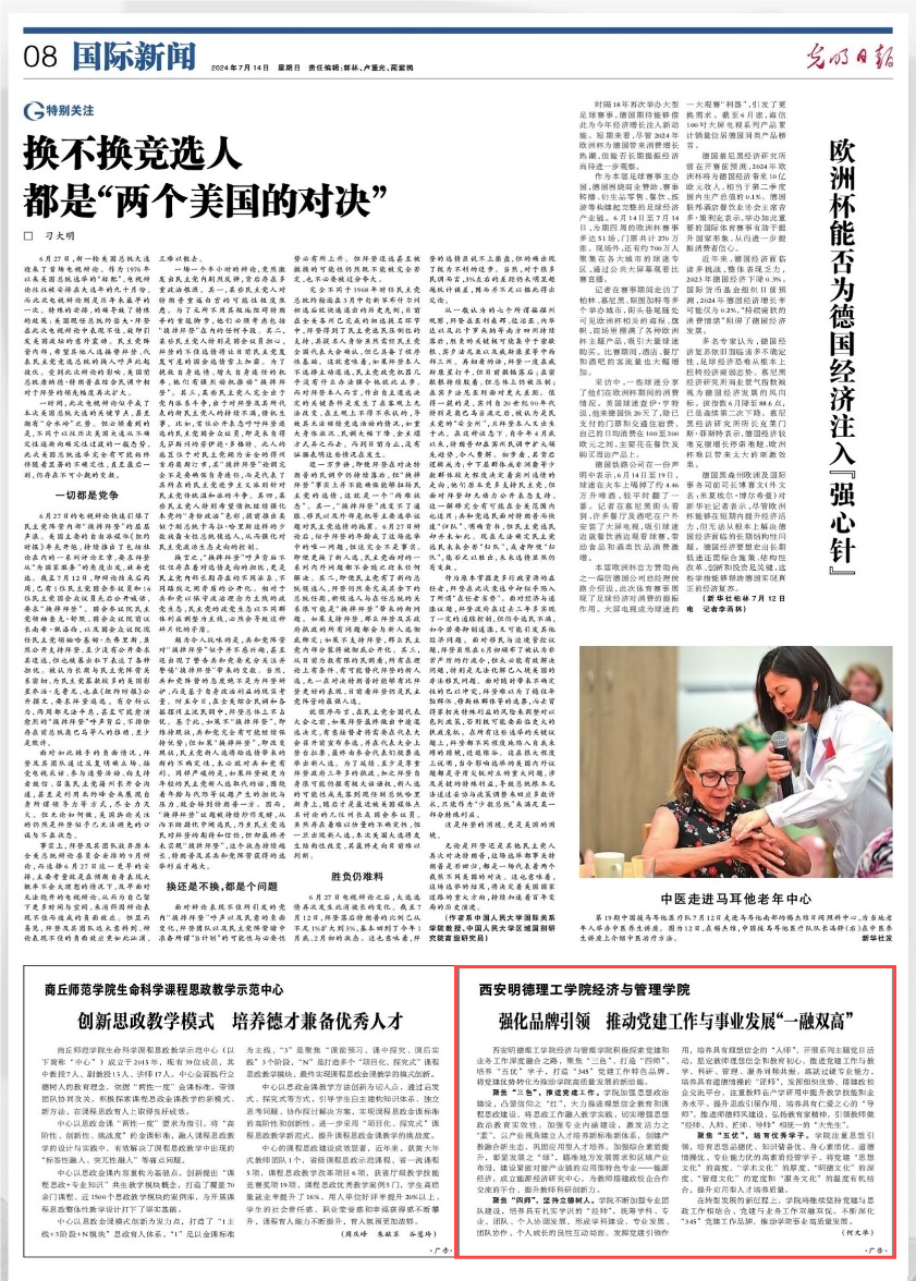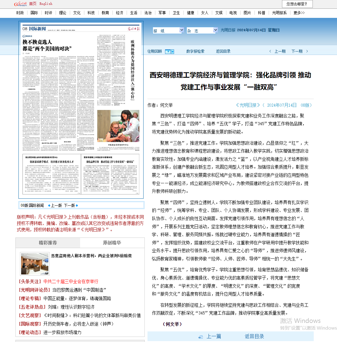 华体会(中国)经济与管理学院以高质量党建引领学院事业高质量发展,积极探索党建和业务工作深度融合之路,实现党建工作与中心工作同频共振。经过近两年的创建,经济与管理学院党委获批校级首批党建工作“标杆院系”创建培育单位,教师党支部获批陕西省第四批党建工作“样本支部”创建培育单位,两个学生支部获批校级党建工作“样本支部”创建培育单位。7月14日《光明日报》第八版“国际新闻”以《华体会(中国)经济与管理学院:强化品牌引领推动党建工作与事业发展“一融双高”》为题,报道了我校经济与管理学院以党建引领,打造“345”党建工作特色品牌,将党建优势转化为推动学院高质量发展新动能。现将原文转载如下: