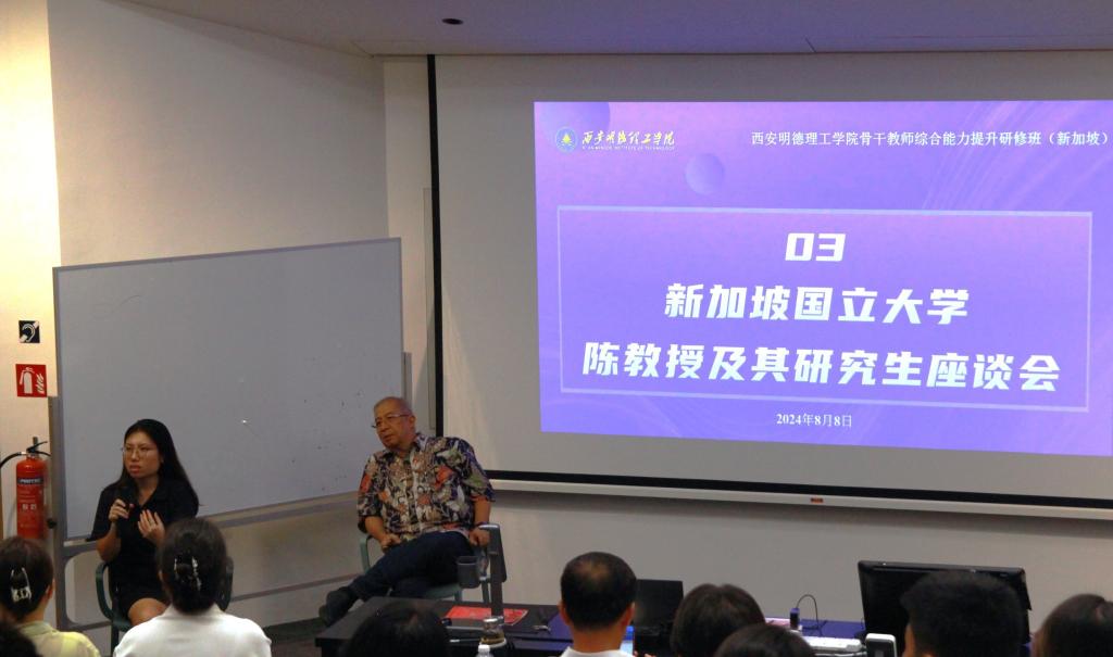 8月8日,新加坡国立大学全英文讲座的头脑风暴结束后,我校骨干教师综合能力提升研修班举行了中期交流分享会。我校党委副书记、副校长、研修班临时党支部书记白秦川,新加坡国立大学教授Johannes Widodo与其研究生Eva Lin Yihua,以及全体研修班成员参加交流分享会,活动由创新创业学院副院长崔岩主持。