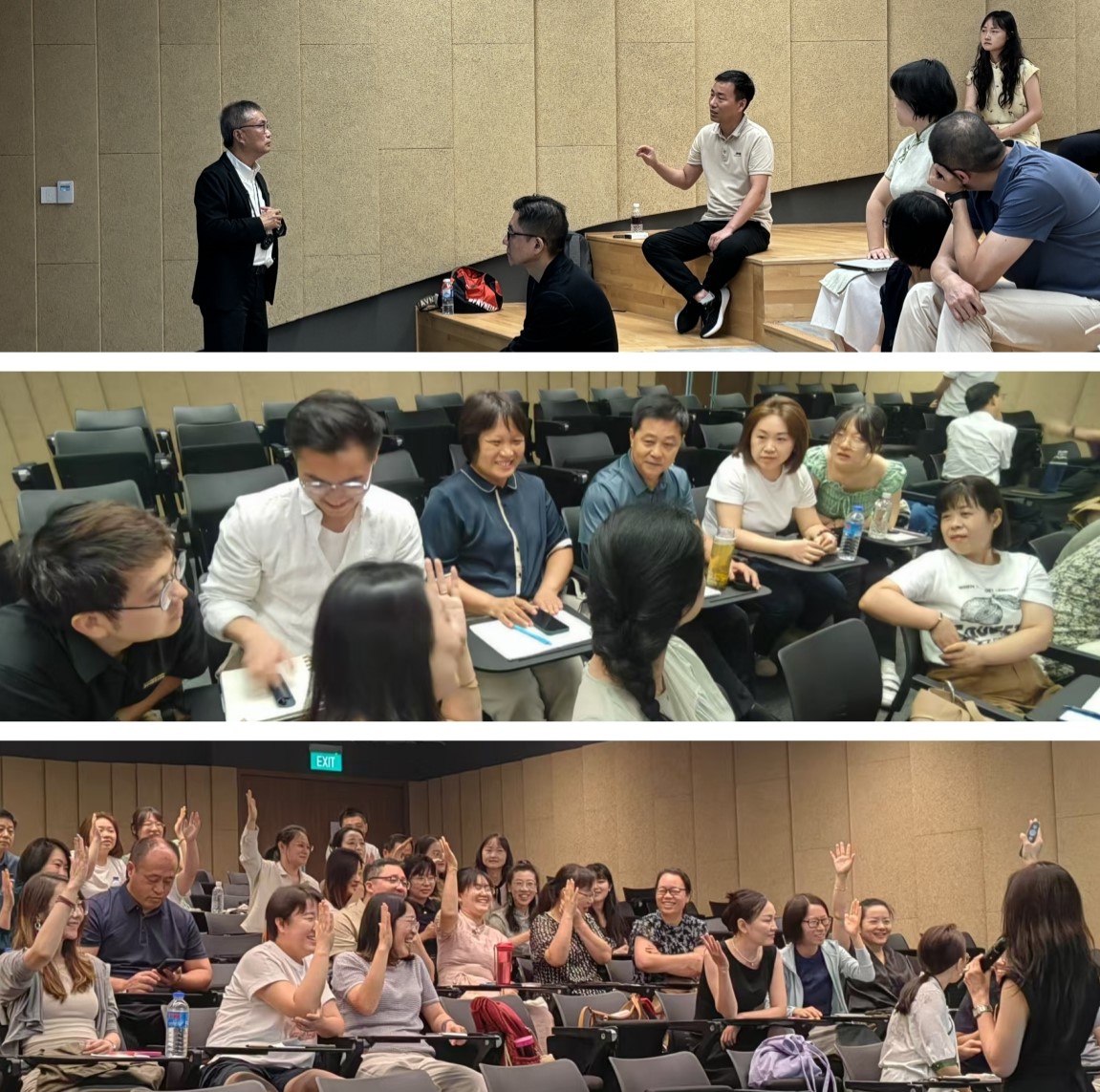 小组分享展风采。交流分享以小组为单位开展。围绕研修前半程的“国际教育AI技术在教学中的应用”、“国际化教学理论技术与改革创新”、“领导力、韧性与应变管理”、“国际一流大学学科设置”等核心课程学习以及在新加坡的实践教学中所见、所闻、所感,各组代表们从不同角度切入,联系自身教学实践、科研工作、教育背景、生活经历等方面各述收获。分享内容丰富,特色鲜明,热情洋溢,感悟深刻。在顶尖学府的教室里展示了我校骨干教师的思想深度与讲台风采。老师们纷纷表示,有信心将所学所获内化至教学科研工作中,为学校本科合格评估及高质量转型发展贡献力量。