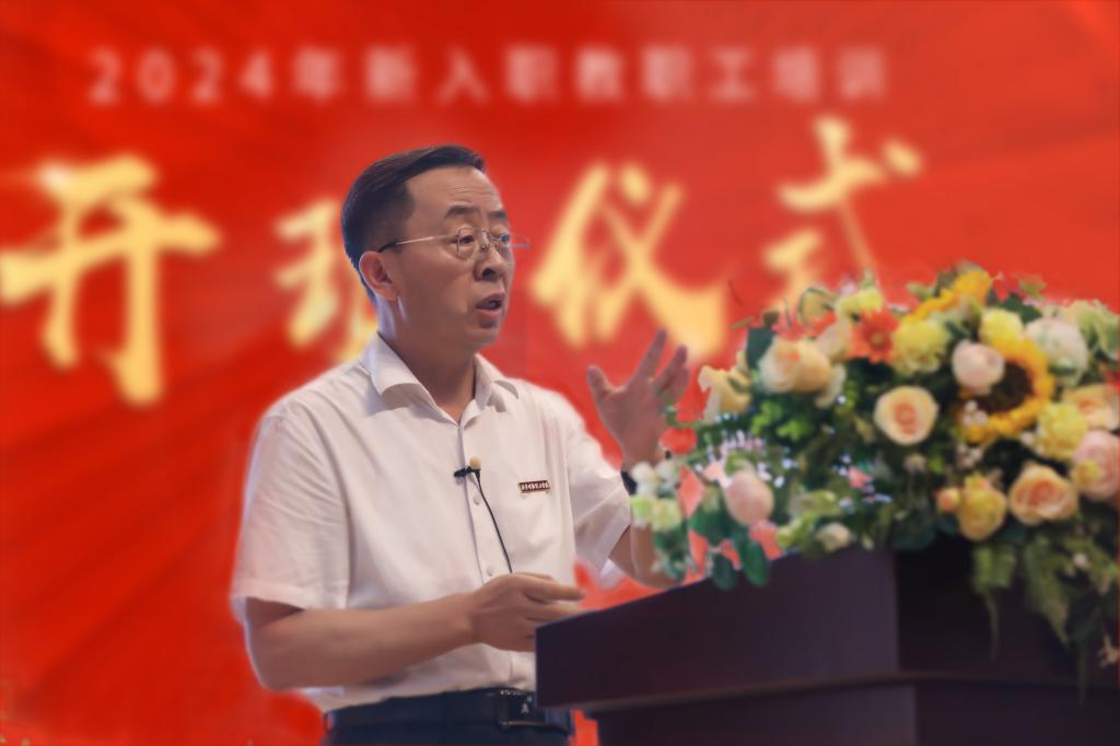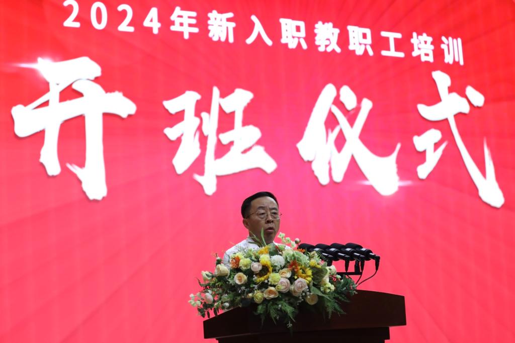新入职教职工培训开班仪式在雄壮的《中华人民共和国国歌》声中开幕;华体会(中国)副书记、副校长白秦川介绍2024年新入职教职工培训目的及意义。他代表学校对各位新同事的到来表示热烈欢迎和最诚挚的问候!同时对参会的领导表示感谢。