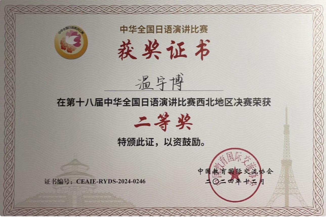 本次大赛由“命题演讲”和“即兴演讲”两部分组成。选手有来自西安交通大学、兰州大学、西安外国语大学等28所院校。温宇博以其扎实的日语功底、丰富的知识储备、严密的思辨能力和沉稳的现场表现,给评委和观众留下了深刻印象,最终与西安交通大学、长安大学、山西大学等院校的学子一同荣获二等奖,属本次比赛同等民办院校中最好成绩。