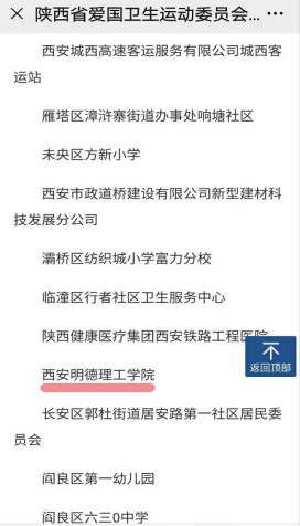 通过校领导的大力支持和各单位积极配合,我部落实责任,把卫生工作摆在了重要位置。2020年西安明德理工学院被陕西省爱国卫生运动委员会授予2020年度“省级卫生先进单位”的荣誉称号。日前,陕西省人民政府网站公布了“2020年度卫生先进单位”评选结果,我校获评陕西省2020年度省级卫生先进单位,在全省278家上榜单位中,是唯一一所获此殊荣的高校。